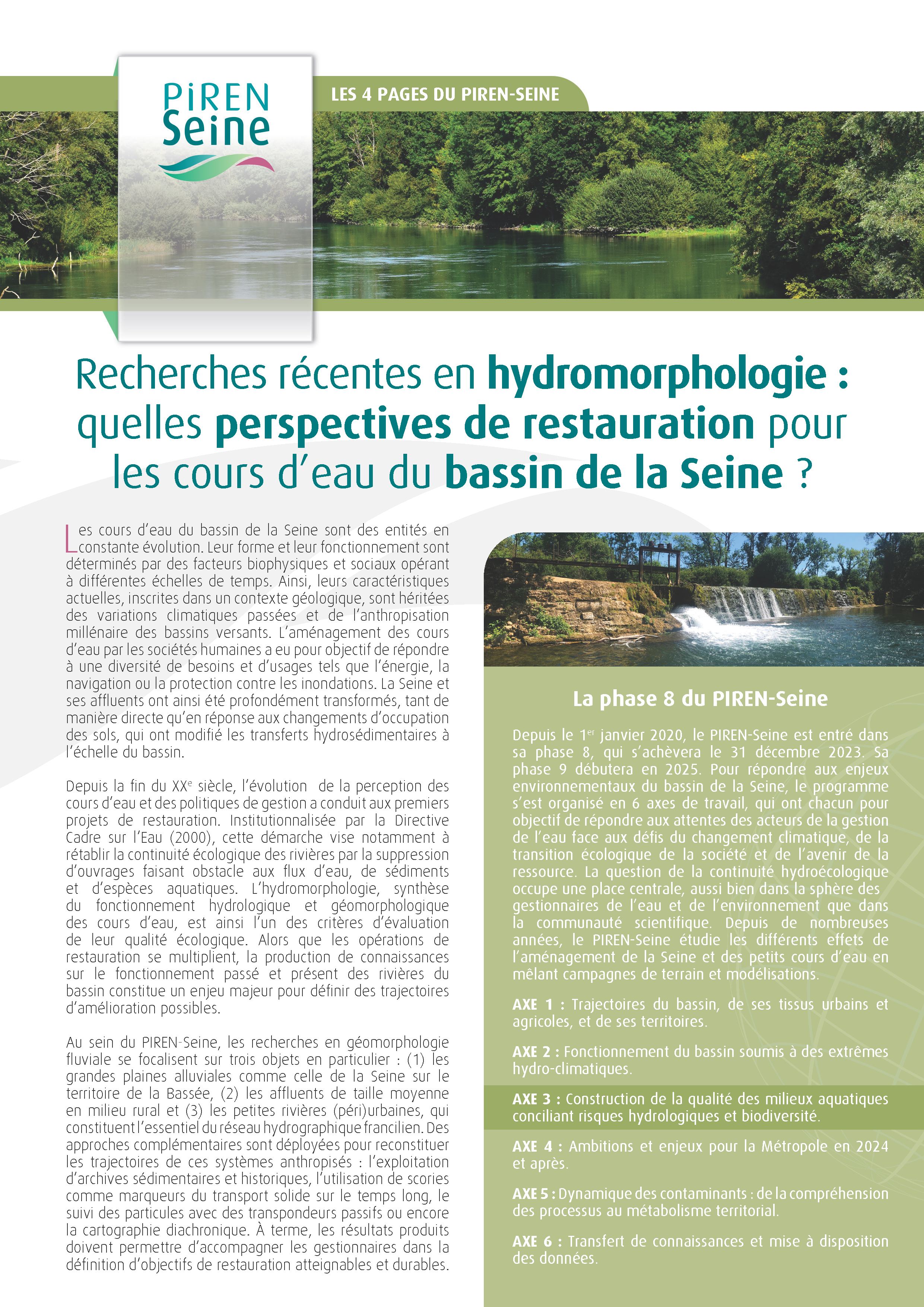 Depuis des millénaires, les cours d'eau du bassin de la Seine ont enregistré les effets des variations climatiques, des modifications des bassins versants (défrichements, urbanisation, etc.) et des aménagements hydrauliques (moulins, barrages, etc.). En conséquence, les caractéristiques hydromorphologiques des rivières ont été profondément altérées, parfois de manière irréversible. Alors que les projets de restauration des cours d'eau se multiplient, la connaissance de la trajectoire des hydrosystèmes sur le temps long s'avère indispensable pour définir des objectifs de gestion. Grâce à des approches pluridisciplinaires, les chercheurs du PIREN-Seine ont étudié les dynamiques passées des systèmes fluviaux, leurs interactions avec les sociétés et les effets de leur (dés)aménagement. Des pistes de réflexion peuvent alors être proposées pour guider les opérations de restauration et répondre aux enjeux socio-environnementaux contemporains.