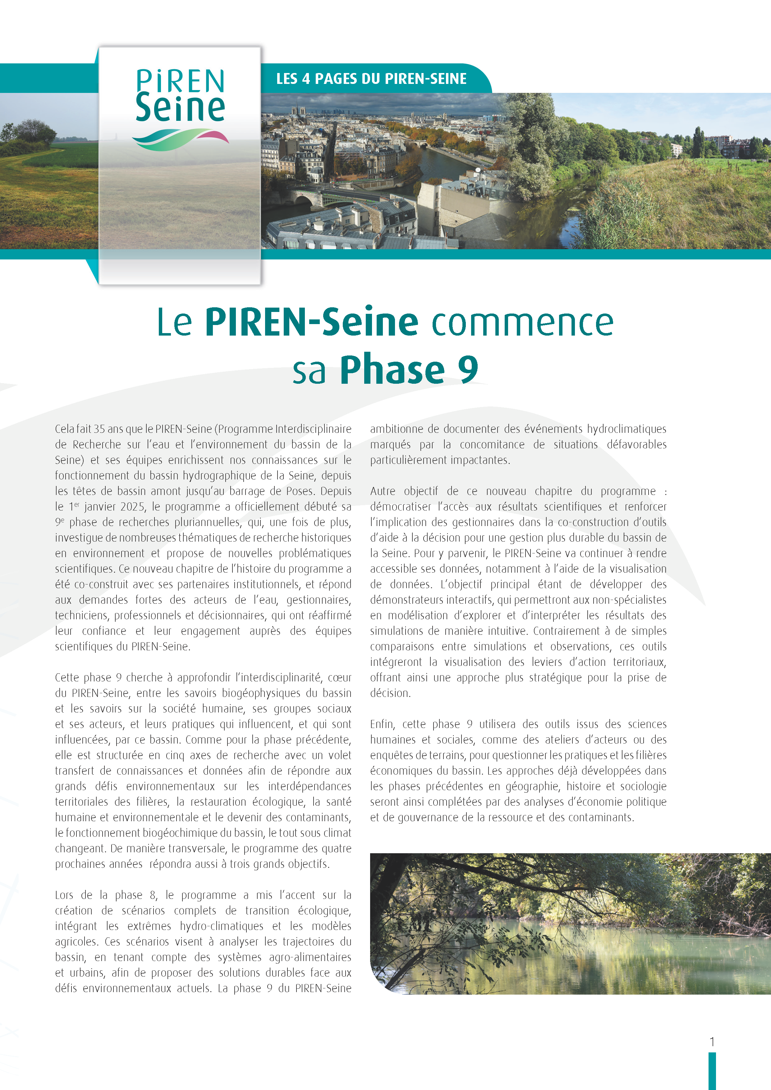 Voilà 35 ans que le PIREN-Seine (Programme Interdisciplinaire de Recherche sur l’eau et l’environnement du bassin de la Seine) et ses équipes enrichissent nos connaissances sur le fonctionnement du bassin hydrographique de la Seine, depuis les têtes de bassin amont jusqu’au barrage de Poses. Depuis le 1er janvier 2025, le programme a officiellement débuté sa 9e phase de recherches pluriannuelles, qui, une fois de plus, investigue de nombreuses thématiques de recherche historiques en environnement et propose de nouvelles problématiques scientifiques.