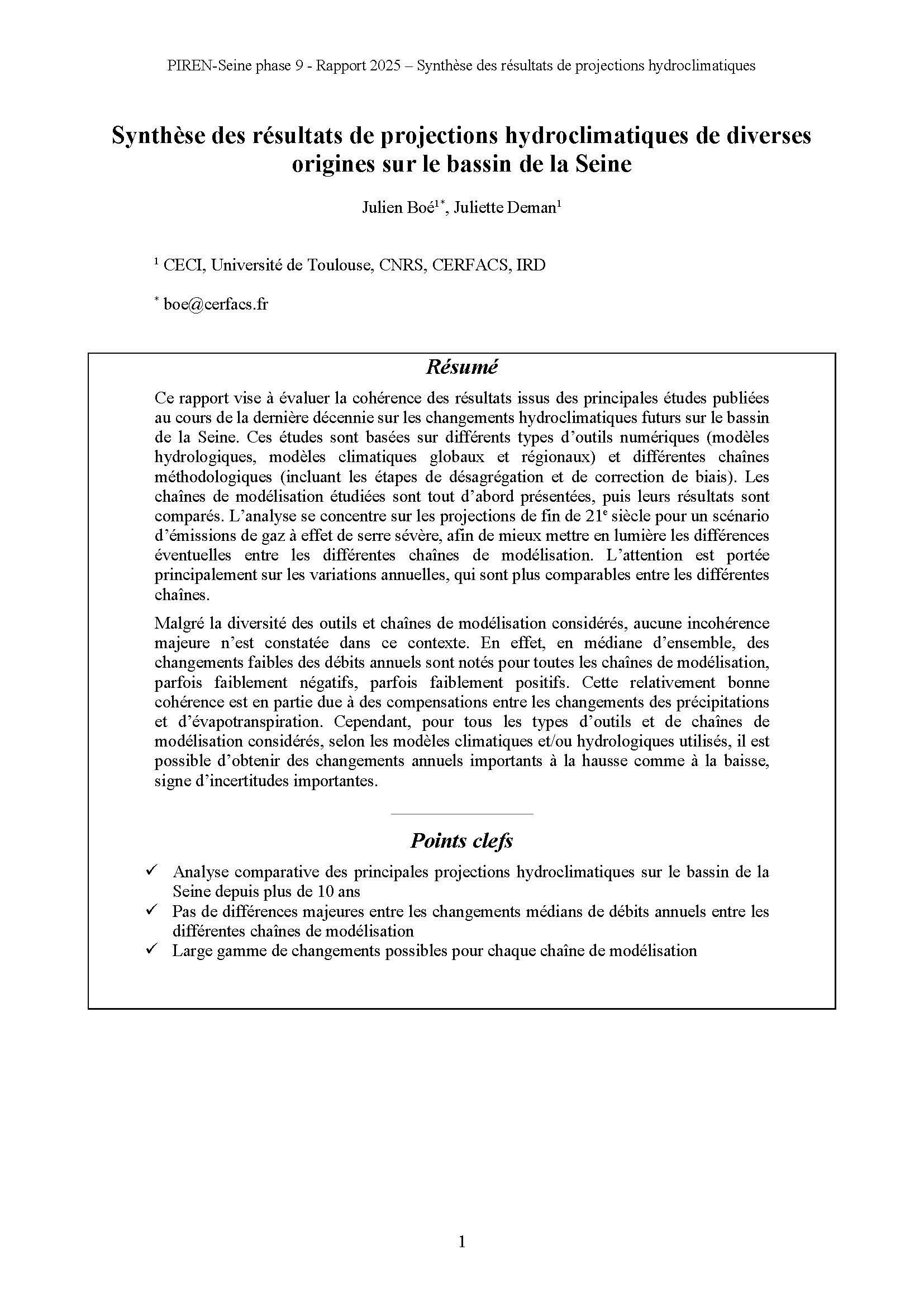 Ce rapport vise à évaluer la cohérence des résultats issus des principales études publiées au cours de la dernière décennie sur les changements hydroclimatiques futurs sur le bassin de la Seine. Ces études sont basées sur différents types d’outils numériques (modèles hydrologiques, modèles climatiques globaux et régionaux) et différentes chaînes méthodologiques (incluant les étapes de désagrégation et de correction de biais). Les chaînes de modélisation étudiées sont tout d’abord présentées, puis leurs résultats sont comparés. L’analyse se concentre sur les projections de fin de 21e siècle pour un scénario d’émissions de gaz à effet de serre sévère, afin de mieux mettre en lumière les différences éventuelles entre les différentes chaînes de modélisation. L’attention est portée principalement sur les variations annuelles, qui sont plus comparables entre les différentes chaînes.